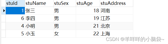 INSERT INTO student(stuName,stuSex,stuAge,stuAddress)VALUES('张三','男',18,'河南');