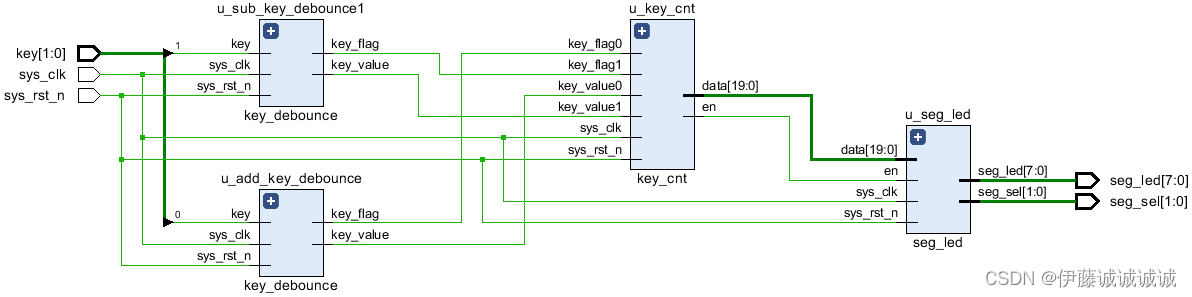顶层模块(top_key_seg)例化了以下三个模块:按键消抖模块(key_debounce)、按键计数器模块(key_cnt)以及数码管动态驱动模块(seg_led)。