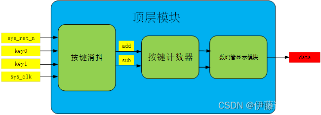 顶层模块主要完成对子模块的例化,并且实现各模块之间的信号的交互。按键消抖模块的输出连接计数器模块,计数器模块的输出data和en传递给动态数码管驱动模块,最后将数据从数码管中显示出来。