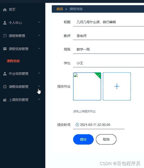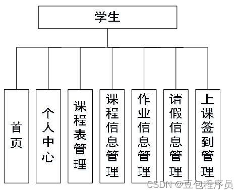 学生注册登录后可进行首页、个人中心、课程表管理、课程信息管理、作业信息管理、请假信息管理、上课签到管理,