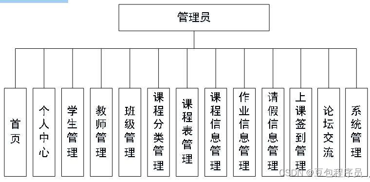 管理员登录后可进行首页、个人中心、学生管理、教师管理、班级管理、课程分类管理、课程表管理、课程信息管理、作业信息管理、请假信息管理、上课签到管理、论坛交流、系统管理
