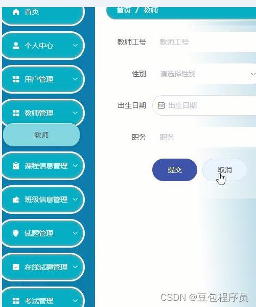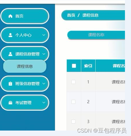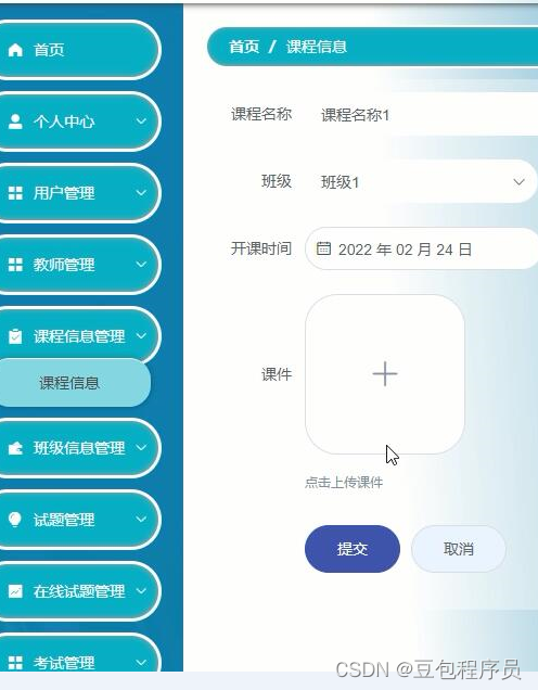 用户登陆后,主要模块包括首页、个人中心、课程信息管理、班级信息管理、考试管理等功能