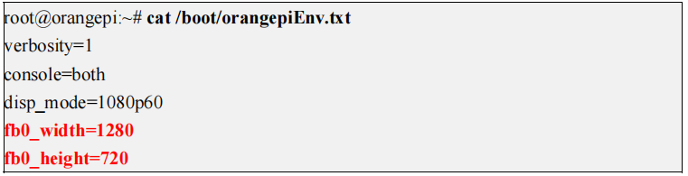 1) 在 linux 系统的/boot/orangepiEnv.txt 中有 fb0_width 和 fb0_height 两个变量,可以 通过它们来设置 Framebuffer 的宽度和高度,linux 系统默认设置 fb0_width=1280、 fb0_height=720