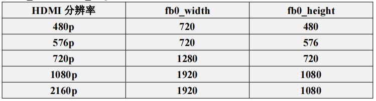 2) fb0_width 和 fb0_height 不同分辨率对应的参考值如下所示