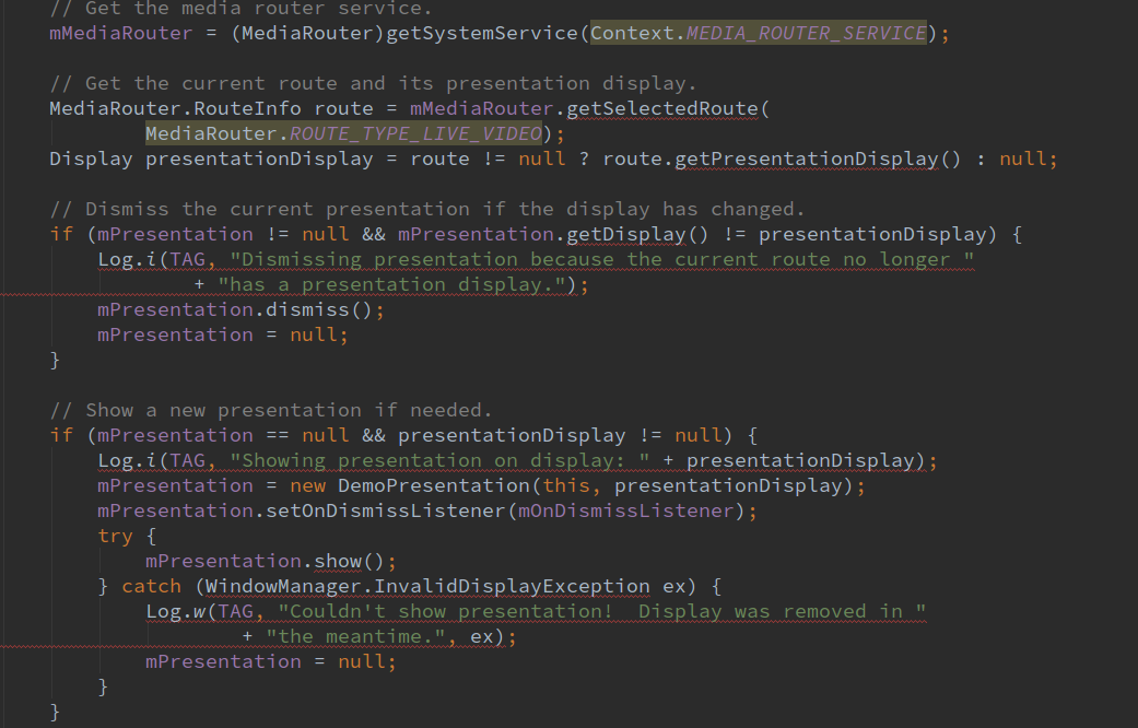 根据上面代码可以看出通过系统服务Media Router来选择一个合适的route,从route中来获取首选的display,如果之前已经有presentation,就要判断一下之前presentation显示的display是否与新的display相同,如果不相同说明首选的display发生了改变,就将该presentation取消,置空,再去创建,否则不用创建。如果是第一次创建presentation只要首选的display不为空就会创建该presentation,创建完成后调用presentation的show方法将该presentation显示出来。