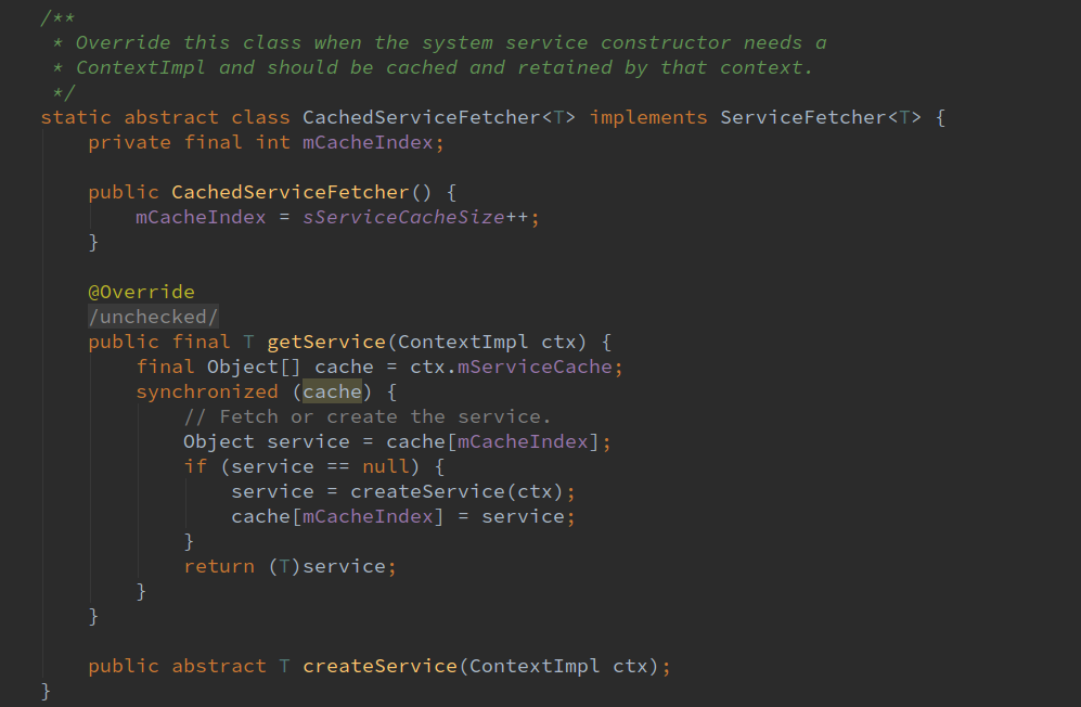 如上文当我们使用getSystemService获取服务时,根据服务name从SYSTEM_SERVICE_FETCHERS中取出fetcher对象,display对象的fetcher对象为CachedServiceFetcher。