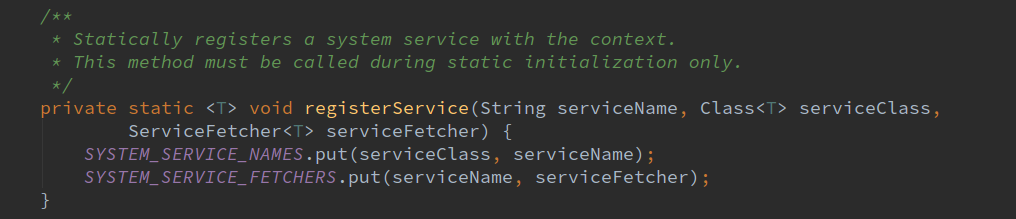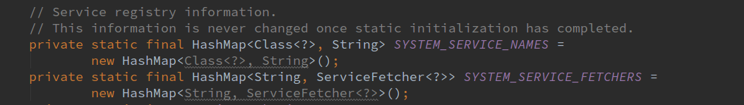 根据SystemServiceRegistry的名字可以看出来,该类是注册了系统服务的,我们通过context以及需要获取对象的name就可以获取相应的系统服务了。下面详细讲解该类。