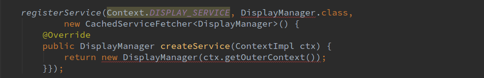 将Context.DISPLAY_SERVICE,DisplayManager.class以及CachedServiceFetcher对象类型为DisplayManager传入registerService函数。