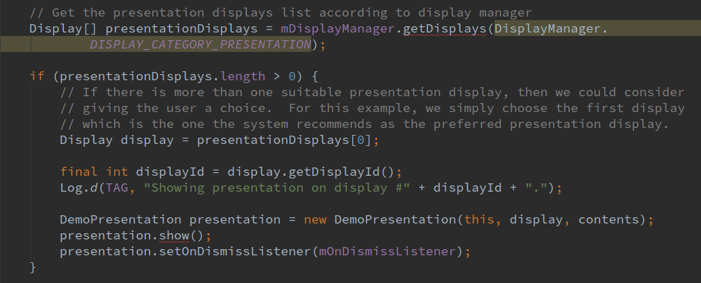 根据上面代码可以看出通过系统服务Display Manager来获取所有适合显示presentation的display列表,如果获取到了多个适合display对象,之后我们就要考虑给用户一个选择,我们选择第一个为首选的display。最后显示presentation。