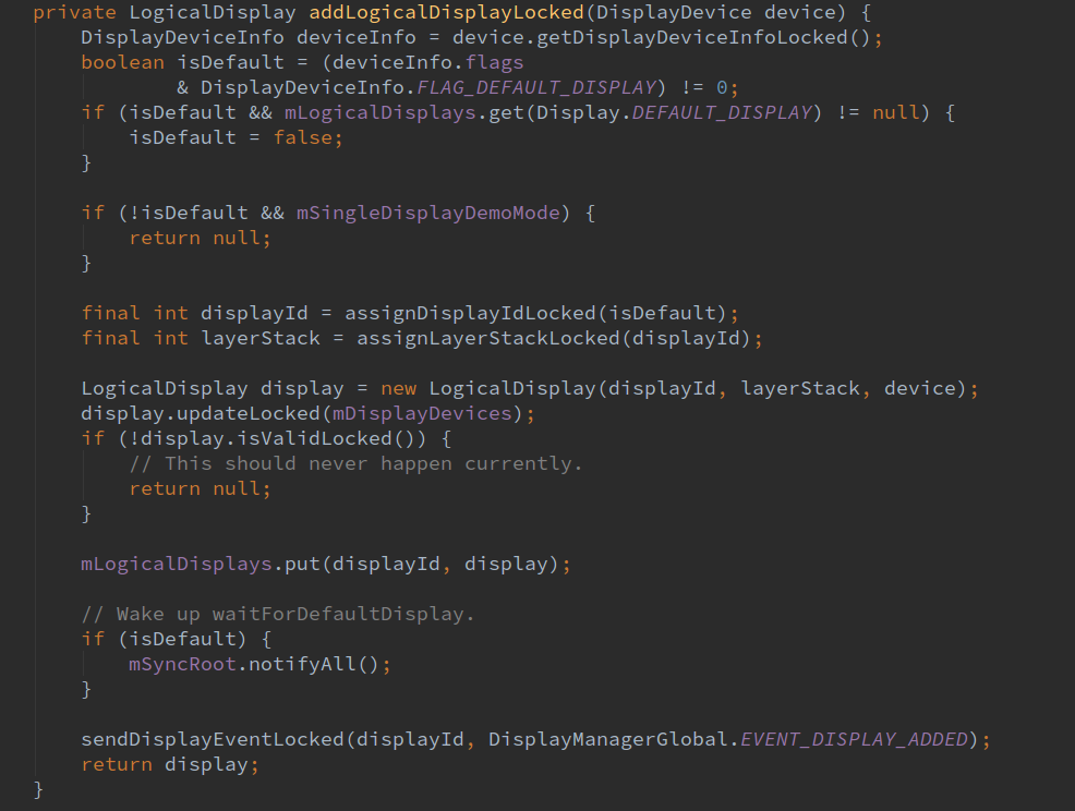 更新完设备信息回到addLogicalDisplayLocked函数,将新创建的设备对象放入mLogicalDisplays列表中,我们可以通过设备id在该列表中获取我们需要的设备对象。