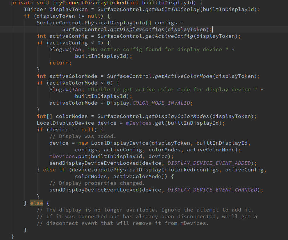 在尝试连接设备时调用SurfaceControl的getBuiltInDisplay函数获取到对应设备id的token对象,如果token为null说明不存在该设备,如果找到对应的token对象,看一下该设备有没有可用的configs,如果没有直接返回。再判断有没有活动的配置activeConfig,如果没有也会返回。最后都满足要求的话,在mDevices列表中获取Device,如果此时还没有创建Device对象,就创建LocalDisplayDevice对象,并且加入mDevices列表,调用sendDisplayDeviceEventLocked发送设备添加的消息,如果之前已经创建过了Device对象就判断该设备的信息是否更新了,如果更新了就发送设备改变的消息。