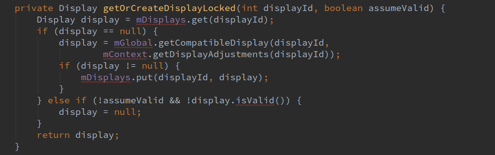 在该函数中根据设备id从mDisplays列表中获取display,如果设备已经添加到了mDisplays列表,并且设备可用,就直接把设备返回。如果设备没有创建出来,就调用DisplayManagerGlobal的getCompatibleDisplay函数创建设备对象,将创建出来的设备添加进mDisplays列表。