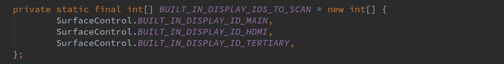 在注册设备时遍历BUILT_IN_DISPLAY_IDS_TO_SCAN列表,在该列表中有主屏幕,HDMI屏幕,依附HDMI的TERTIARY屏幕三种类型的屏幕。依次根据这三个设备调用tryConnectDisplayLocked函数来尝试连接设备。