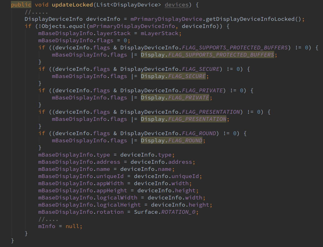 在创建LogicalDisplay时也创建一个mBaseDisplayInfo对象,之后调用updateLocked函数来根据可用的Device来更新logical display,如果logical display依附的设备已经被移除了它就不可用了。updateLocked函数主要内容如下: