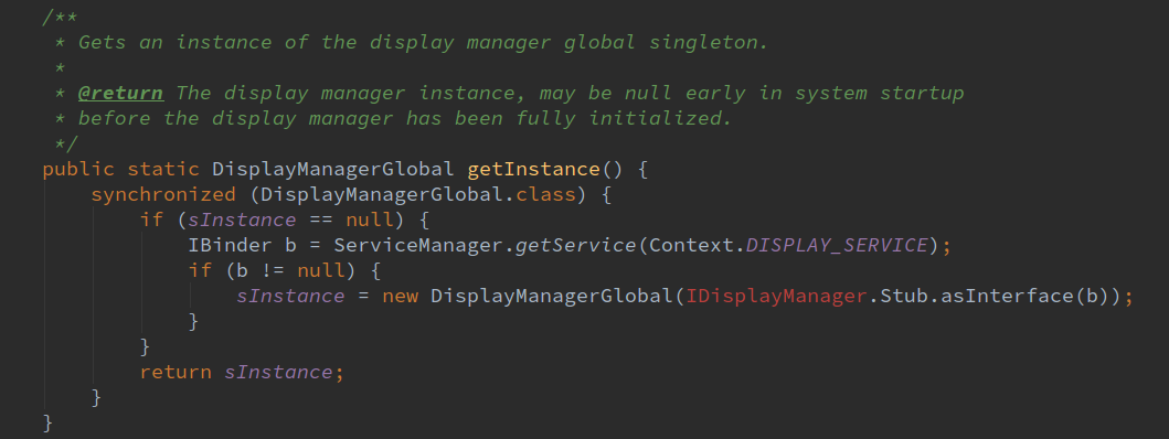 在getInstance函数中,创建一个Display服务的binder对象,将binder转换成IDisplayManager接口对象,记录在成员变量mDm中。