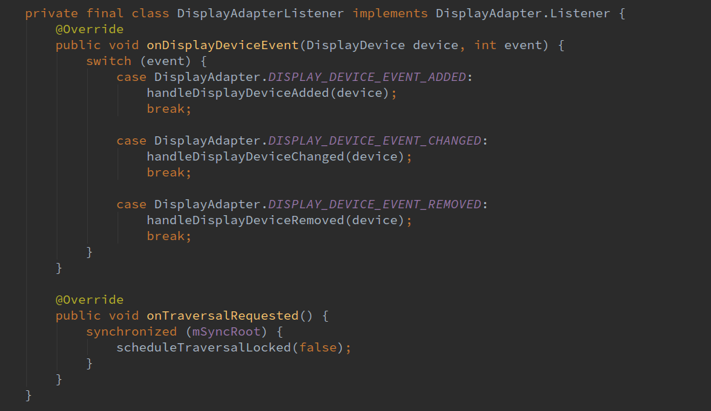 在DisplayAdapterListener中监听了设备的增加,变化,移除事件。