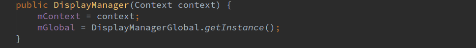 在DisplayManager的构造函数中将传入的context对象记录在mContext成员变量中,并且创建DisplayManagerGlobal对象,mGlobal对象的创建属于单例模式。