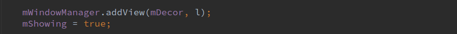 重新回到Dialog的show函数中,通过PhoneWindow的getDecorView函数获取顶层的mDecor对象,如果mDecor为空就调用installDecor函数进行获取Decor对象。获取到mDecor对象后调用addView将该对象添加到WindowManager中。最后调用到WindowManagerGlobal的addView函数来添加view。