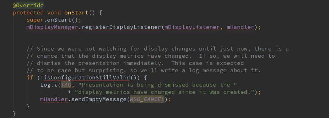 在Presentation的onStart函数中注册mDisplayListener监听,用来监听设备的移除,配置改变。现在就要开始监视设备的改变了,可能display metrics已经发生改变,例如转屏等事件发生,如果设备信息真的发生了改变就需要将presentation立即取消。