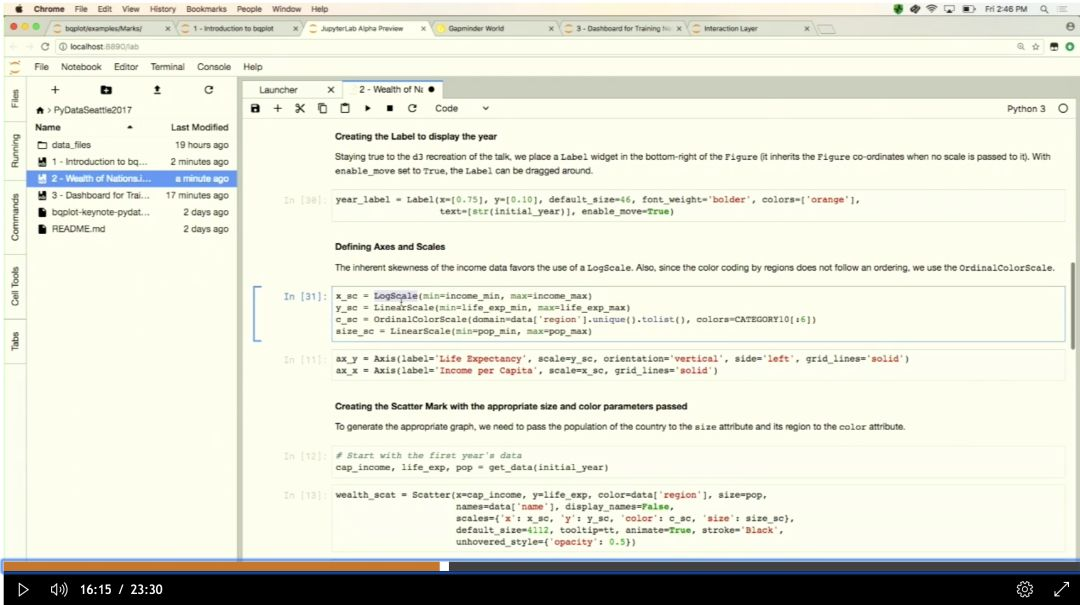 光有这些看起来好像还是不过瘾,宝器找到了一个bqplot官方团队的讲解视频,详细的介绍了如果通过bqplot构建交互式图表、仪表板和丰富的GUI应用程序。