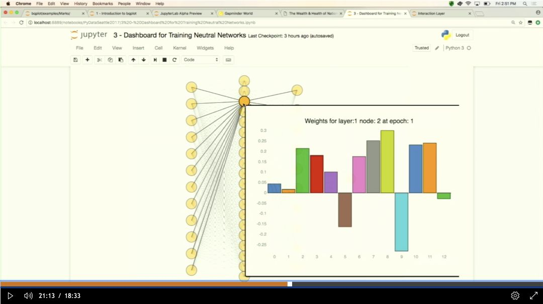 并且使用bqplot和流行的深度学习库的示例,直接在笔记本中构建自定义的可视化仪表板,包括网络可视化和其他新颖的交互方式来控制网络训练过程。