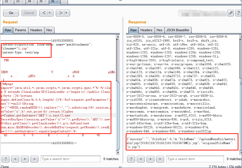 操作步骤:上传jpg文件:1.jpg;然后上传,利用抓包工具进行抓包,获取请求,修改请求头filename为1.jsp,内容更改,绕过后台校验