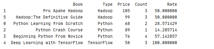 5 ,['Beginning Python From Novice','Python',76,4],['Deep Learning with TensorFlow','TensorFlow',58,3],['Hadoop:The Definitive Guide','Hadoop',99,3]]