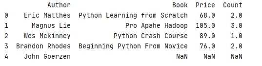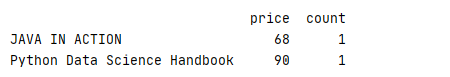 41 price=pd.Series(['68','90'],name='price',index=['JAVA IN ACTION','Python Data Science Handbook'])