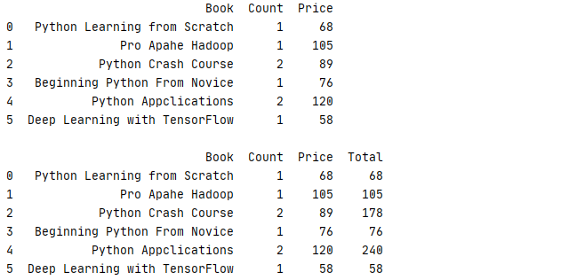 6 book.eval('Total=Price*Count',inplace=True)