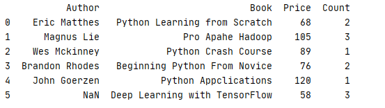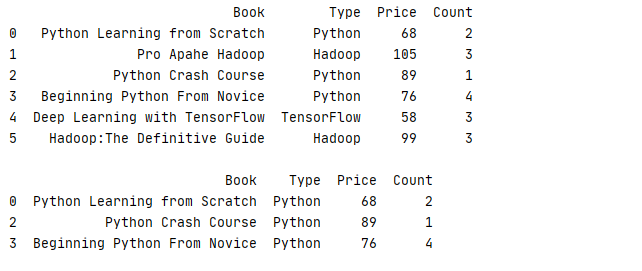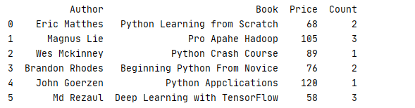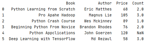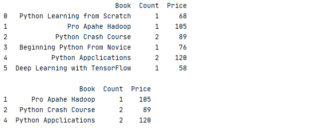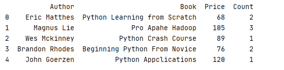 1 _book=[['Python Learning from Scratch','Python','AI',68,2],['Pro Apahe Hadoop','Hadoop','BG',105,3],['Python Crash Course','Python','AI',89,1]