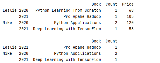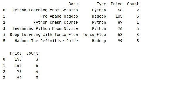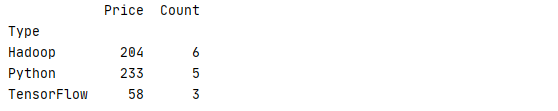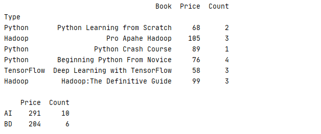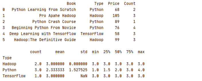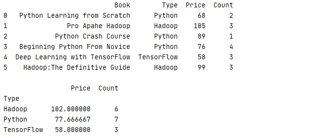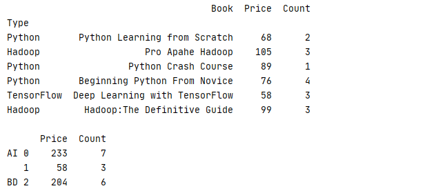 6 print(book.groupby('Type').aggregate({'Price':'mean','Count':'sum'}))