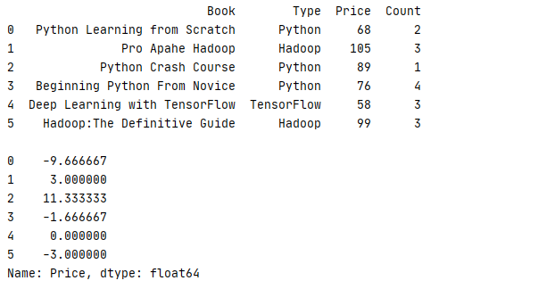 6 print(book.groupby('Type')['Price'].transform(lambda x:x-x.mean()))