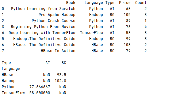 7 8 print(str(book.groupby(['Language','Type'])['Price'].mean().unstack())+'n')