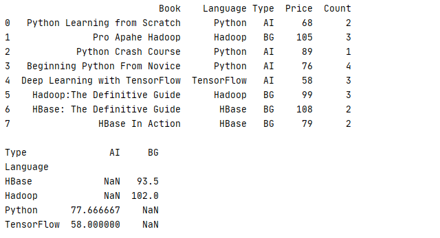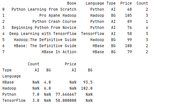 7 print(book.pivot_table(index='Language',columns='Type',aggfunc={'Price':np.mean,'Count':'sum'}))