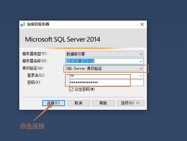1.我们用SQL Server 身份验证,输入登录名和密码,点击连接: