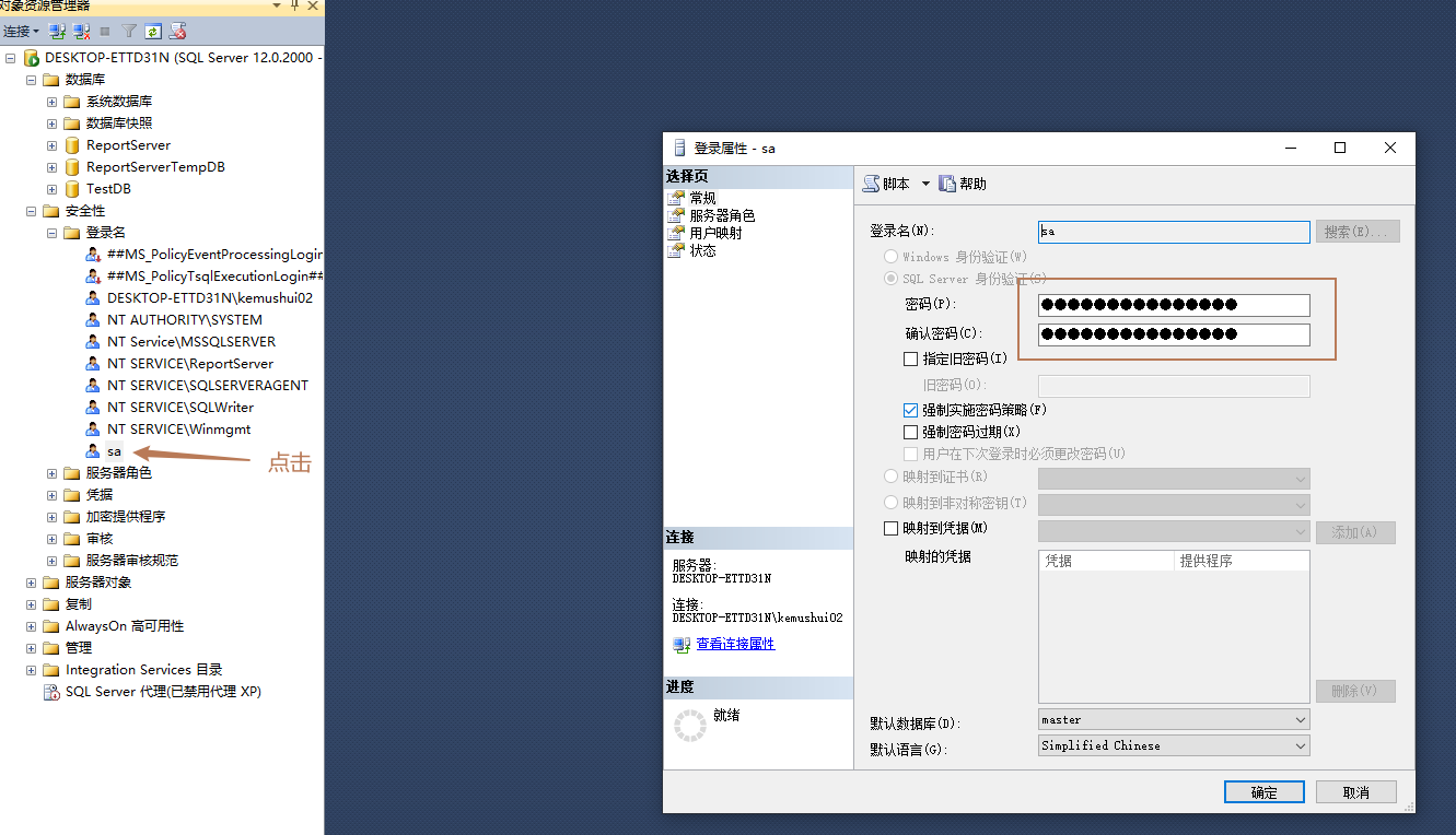 5.连接之后,点击sa就可以更改密码了,再断开连接,用sa连接