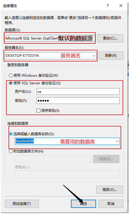 5.就会弹出一个选择属性,这里的数据源不是我们需要的数据源,所以,我们要重新找,输入服务器名(数据库连接的服务器名),使用SQL Server身份来登录: