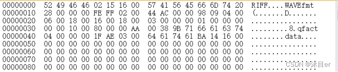 第13-16字节:66 6D 74 20 波形格式标志, 一般都是 fmt , 其中 0x20 对应的字符是空格