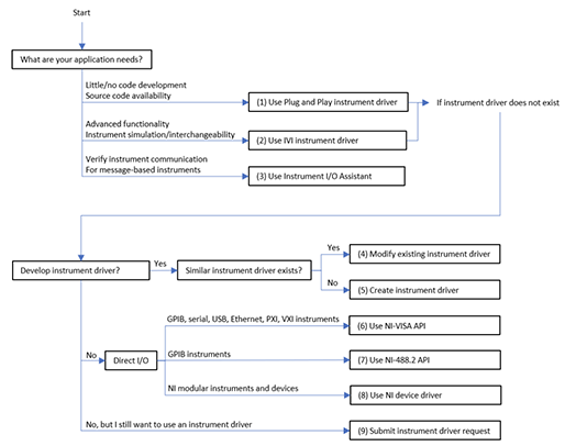 NI提供了各种仪器连接接口,可满足不同需求。因此,为应用选择合适的一个非常重要。首先,请参阅以程图,以确定控制仪器的正确方法。然后,参考与流程图编号对应的部分,以了解有关接口的更多信息。