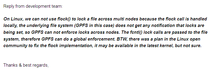 4. 在一个项目中使用了GPFS共享文件系统,我们在开发过程中发现,对于FLOCK锁只支持本地,而POSIX锁则可以支持跨主机加锁。例如:我们有两台独立的机器A和B,在A机器上有某个进程对文件f加POSIX独占锁,然后在B机器上当有某个进程想对f加POSIX独占锁时,就会失败。可是当我们使用FLOCK锁时,就发现两台机器对同一个文件加FLOCK锁是互不影响的,即A和B机器都可以对f加独占锁。针对这种情况,IBM工程师在邮件中给出的解释如下: