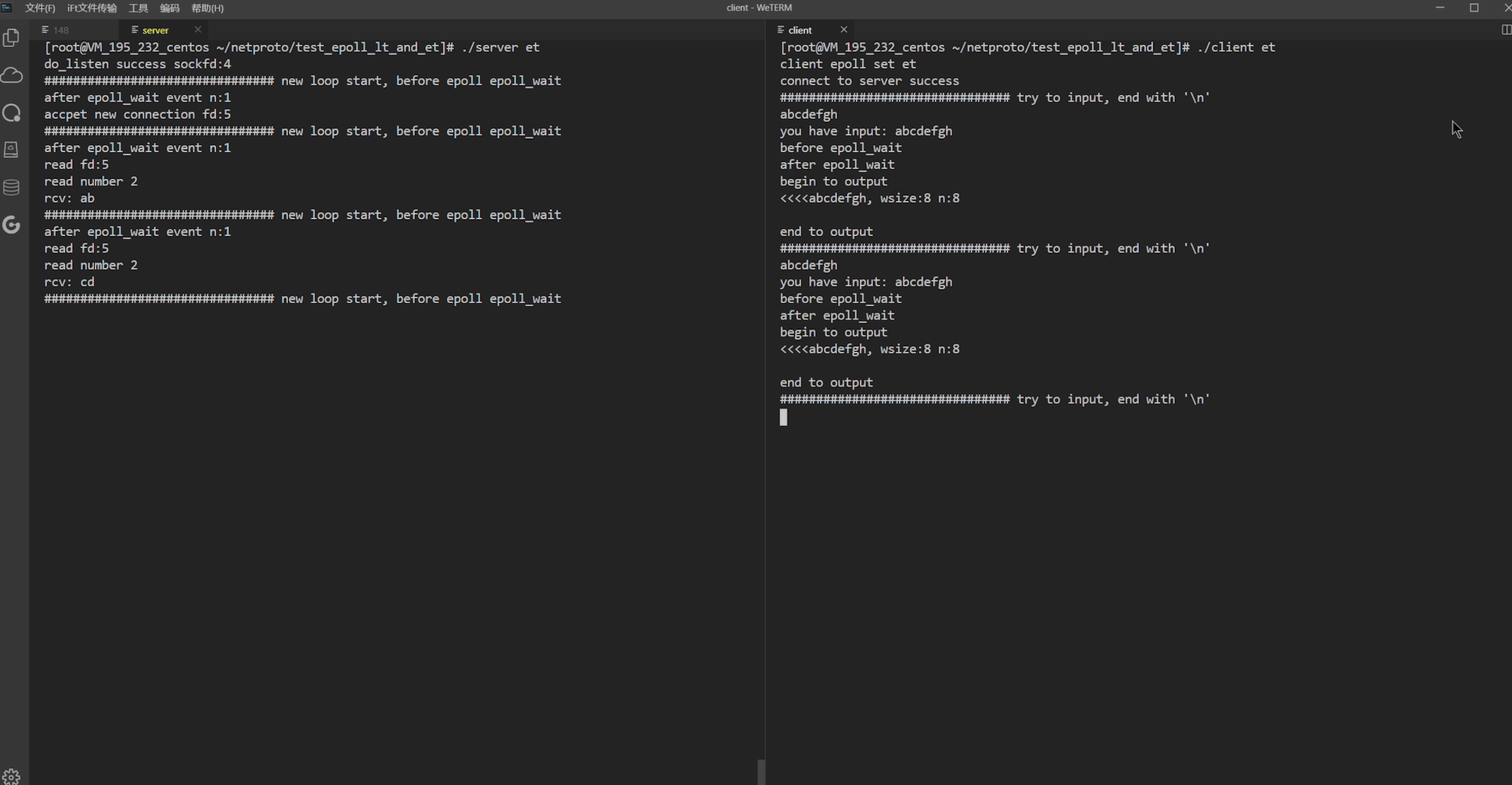 看一个实验 ,直观感受下 2 种模式的区别, 客户端都是输入“abcdefgh” 8 个字符,服务端每次接收 2 个字符。