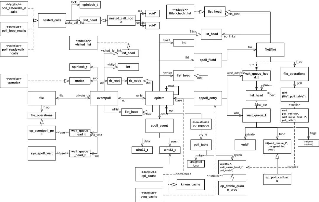 本文通过 10 个问题,其实也是从 10 个不同的视角去观察 epoll 这间宏伟的殿堂。至此也基本介绍完了 epoll 从监视事件,到内部数据结构组织、事件处理,最后到 epoll_wait 返回的整体工作过程。最后附上一张 epoll 相关数据结构间的关系图,在学习 epoll 过程中它曾解答了我心中不少的疑惑,我愿称之为灯塔~