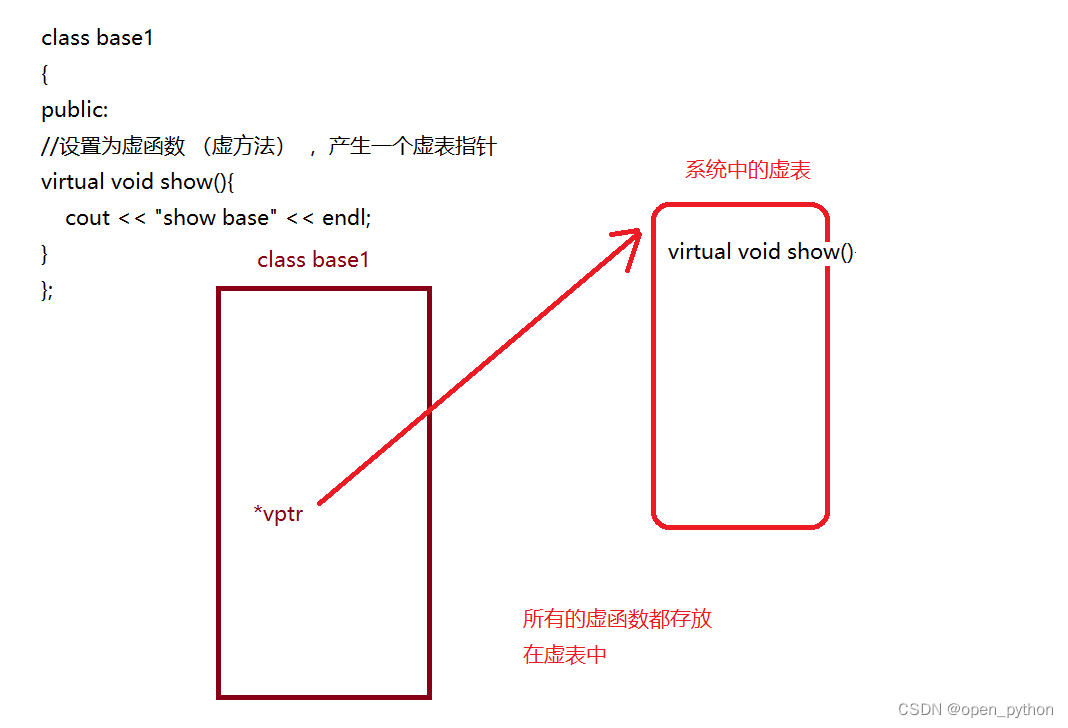 2、virtual ,含有虚方法,系统就会创建一个 *vptr 指针,指向系统中的虚表。