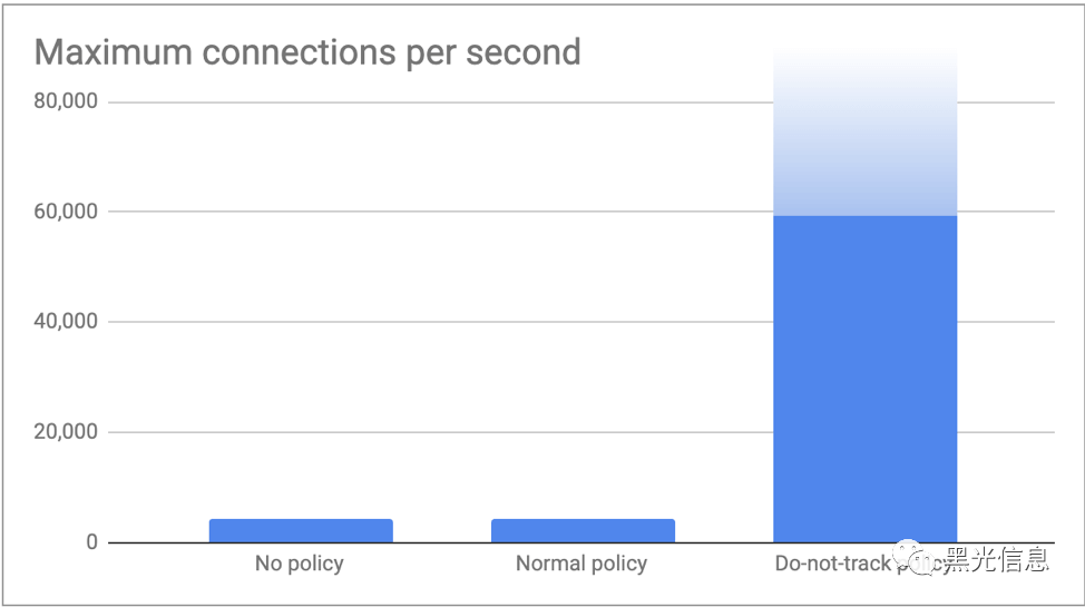 在第二个测试中,我们推送了尽可能多的客户端连接,并测量了 memcached 服务器每秒能够处理的最大连接数。正如预期的那样,没有策略和正常策略都达到了 conntrack 表限制,即略高于每秒 4,000 个连接(512k / 120s = 4,369个连接/秒)。在不跟踪政策实施的情况下,我们的客户每秒推送了 60,000 个连接,而没有遇到任何问题。我们很有信心,我们可以通过增加更多的客户来超越这一点,但感觉数字已经足够说明这篇博客的要点!