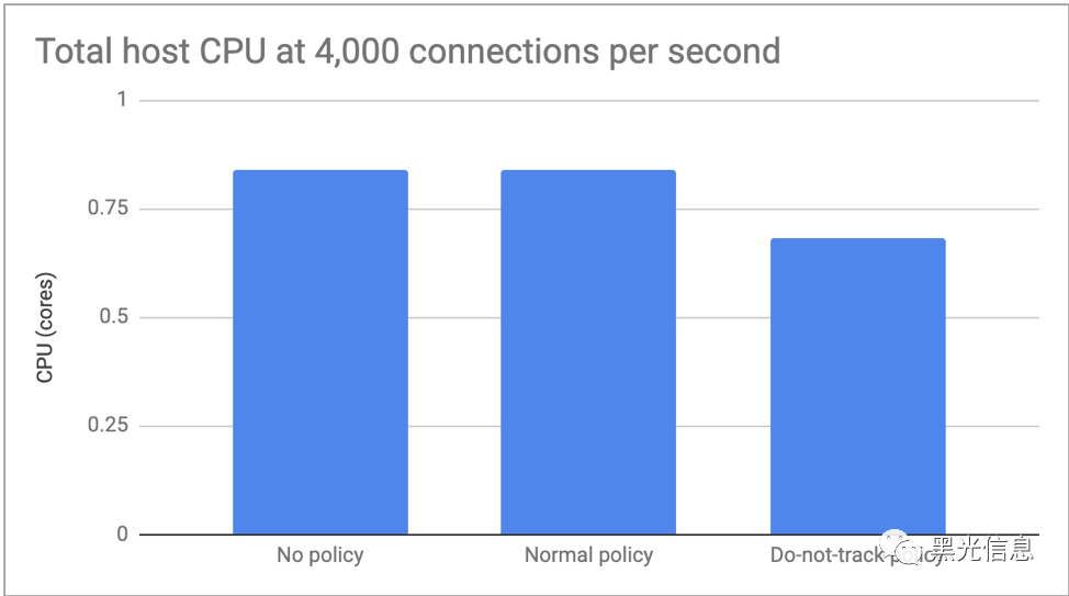 - 不跟踪网络策略应用于每个包,而正常网络策略只应用于流中的第一个包。这可能会增加每个包的 CPU 成本,因为每个包都需要由网络策略处理。但是对于短连接,这种额外的处理开销被不使用 conntrack 的优化所抵消。例如,在SaaS提供商的案例中,每个连接中的数据包数量非常少,因此对每个数据包应用策略的额外开销是合理的。