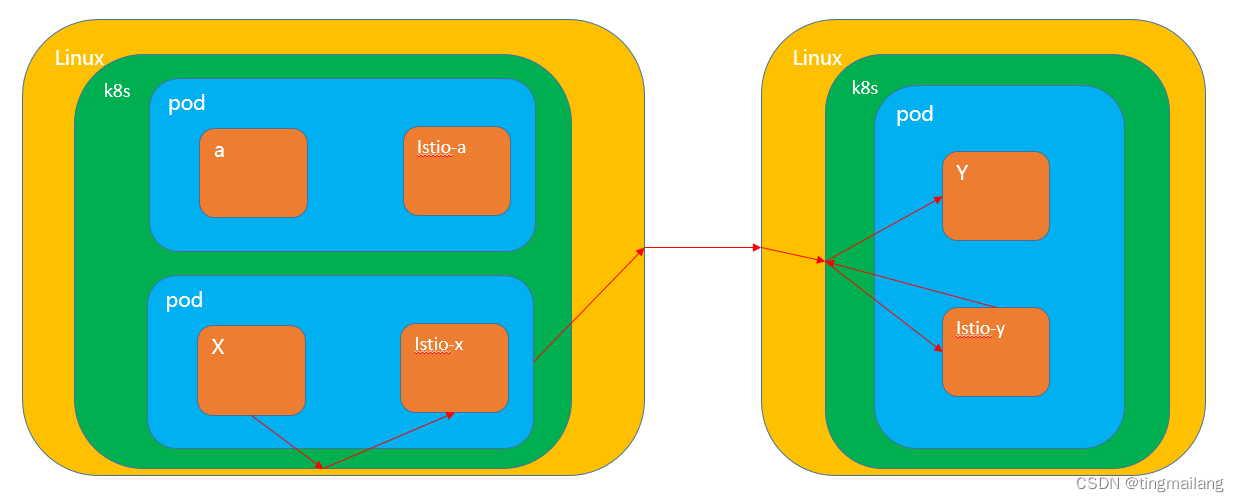 ⑧服务网格2接收请求数据,转发给y服务处理