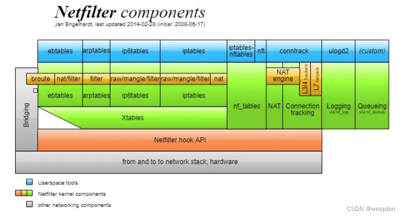 Netfilter框架由著名的Linux开发人员Rusty Russell于1998年开发,旨在改进以前实现ipchains(Linux2.2.x)和ipfwadm(Linux2.0.x)。