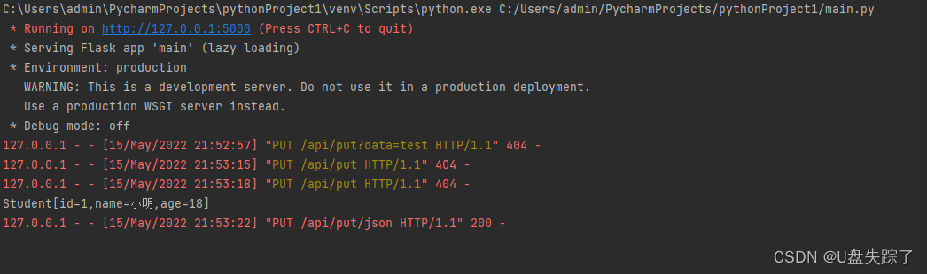 以上就是听话彩虹最近收集整理的关于Python Flask 请求GET、 POST 、PUT、 DELETE1,示例一个简单的请求2,get 传参的方法一3,get 传参的方法二4,POST form表单提交内容 5,POST json 6,PUT 传参的方法一7,PUT 传参的方法二8,PUT json9,DELETE的全部内容,更多相关Python内容请搜索靠谱客的其他文章。