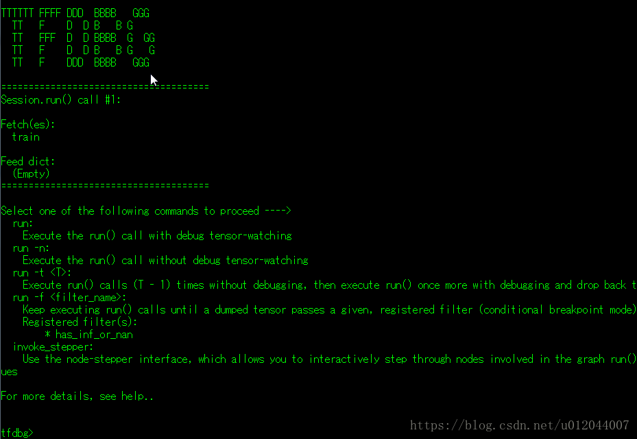 在每次执行代码就会进入TensorFlow的debug(tfdbg)模式,如图: