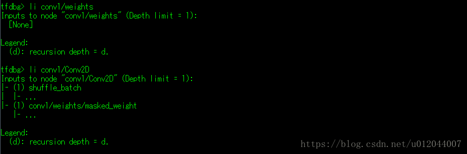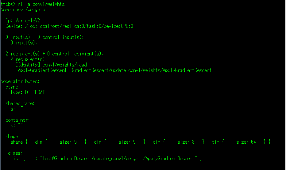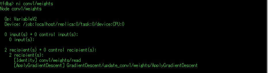 (3)ni 命令:显示指定张量的信息,信息主要是显示输入和接收节点的信息(详细内容可使用下面的li命令和lo命令)。